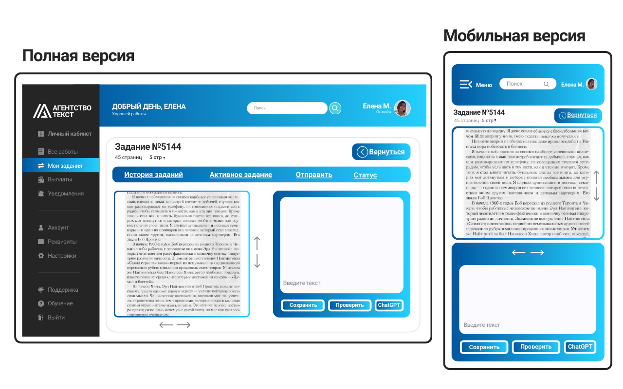 Вся работа будет проходить в вашем личном кабинете онлайн. Здесь вы сможете получать задания, скачивать материалы, обрабатывать текст и отправлять готовые работы.
